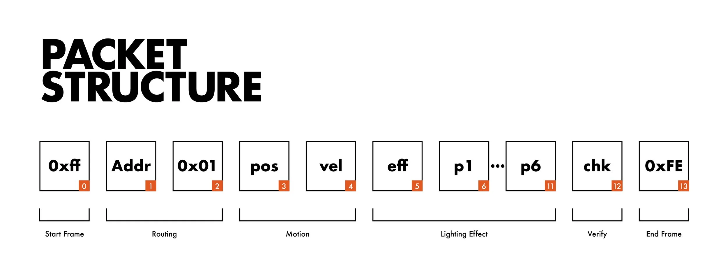 The ESP32-S3 controller generates real-time sine wave positions for each node and packages them into compact 14-byte packets — bundling motor position, velocity feedforward, and LED parameters into a single frame sent over the RS485 bus.