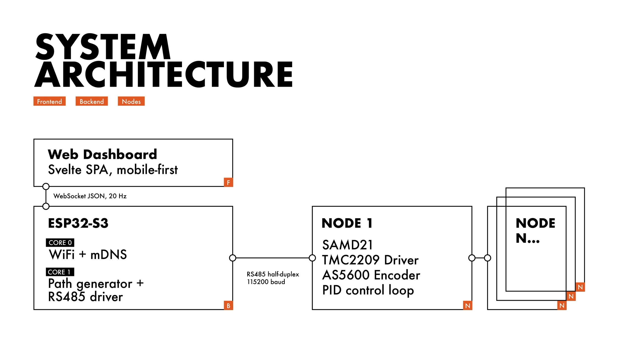 The system has three layers. A Svelte web app connects over WebSocket to the ESP32-S3 controller, which translates commands into RS485 packets. Each motor node (SAMD21 + TMC2209 driver + AS5600 encoder) runs a closed-loop PID controller to track the target angle and reports status back when polled. The full round trip runs at 10–20 Hz per motor.